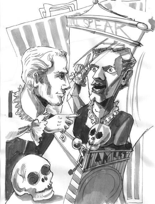 But of all the various Hamlet drafts theorised to exist, perhaps the most contentious is: 'The Comedy of Hamlet, Prince of Zombies'. Extrapolated from scribbled margin notes in Kit Marlowe's early draft of 'The Massacre of Paris', the play is unique in that it was originally thought to have been performed backwards.